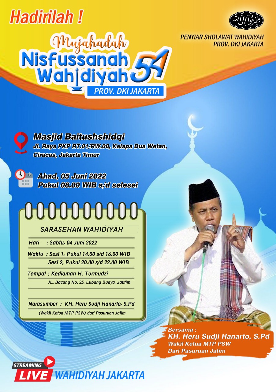 Pemberi Kuliah Wahidiyah : Bapak KH. Heru Sudjihanarto, S. Pd, Wakil Ketua MTP PSW Sambutan mewakili Ketua Umum DPP PSW : Bapak K. Zainul Arifin, S. Pd. I, Ketua DPP PSW