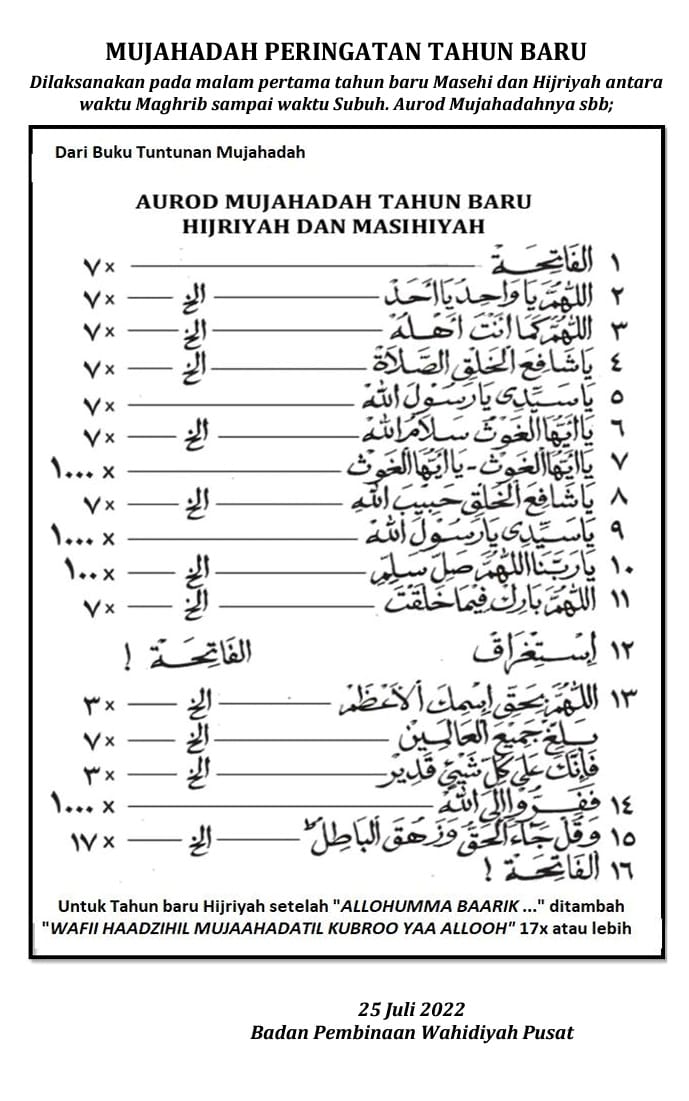 Pada tahun baru hijriyah ataupun masehi, kita dibimbingkan untuk melaksanakan mujahadah dengan aurod mujahadah tahun baru. Mujahadah ini kita dapat kita laksanakan dimulai pada hari jumat 29 Juli 2022 bakda magrib hingga waktu subuh pada hari sabtunya.